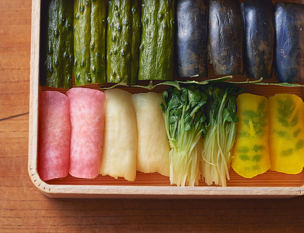 蘭発祥の漬物のにぎり寿司。ごく浅い糠漬けの茄子、胡瓜は生姜を効かせて、赤かぶと大根はごまとわさびの風味とともに、貝割れはさっと湯引きしてシャキシャキの歯ごたえと香りを、たくあんには木の芽をしのばせて…それぞれの素材の味を引きだすひと手間が当店ならではの味を生み出します。